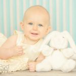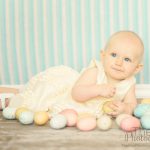 But it’s no doubt at all that this gorgeous little girl is ready for Springtime! Baby Rowan came to visit us last week dressed in her Easter best, and had all of us girls at the studio laughing with her big, drooly smiles and silly personality! We love how piercing her eyes are against this blue stripe background – just stunning!