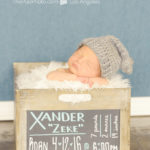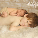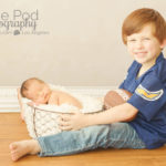 It is always a treat when older children accompany their newborn sibling to the photo session at our Los Angeles photography studio. Especially when there older sibling is 5 years or older! As you can imagine, the most popular difference in age is about two years – so we see a ton of two year old siblings at newborn photo shoots. With toddlers they have a tough time sitting still, holding their babies or even just looking at the camera. That’s why we were so excited when this five year old big brother walked in and was super well behaved and ready to have fun with some photos with his new little brother. It was so exciting when he laid perfectly still while we settled and quieted his nine day old brother on his back. It looks like this baby boy is sleeping very deeply in the photo – but it definitely took a lot of soothing (of both baby and big brother!) with professional assistants focused on the baby’s safety on both sides of them, to get this shot. It was one of the family’s favorites – it’s not difficult to see why!