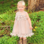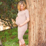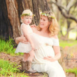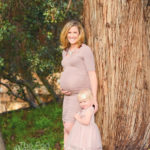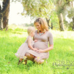 Actually, this mom was considering leaving her daughter at home and having the pictures be of just her and the belly bump. However, when she was at our photo studio that services the Pasadena, CA area – for her dress fitting she saw something that changed her mind. We have several matching mother-daughter dresses, and the dusty rose colored dresses that both mom and daughter are wearing in these photos are ours. This mom saw the rose-colored ruffled dress and decided that she absolutely HAD to do matching-outfit maternity pictures with her daughter – the dress was too cute!